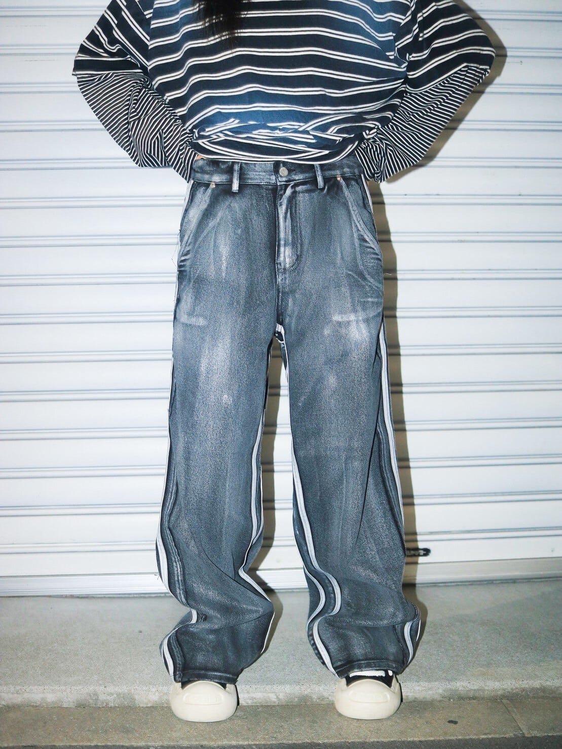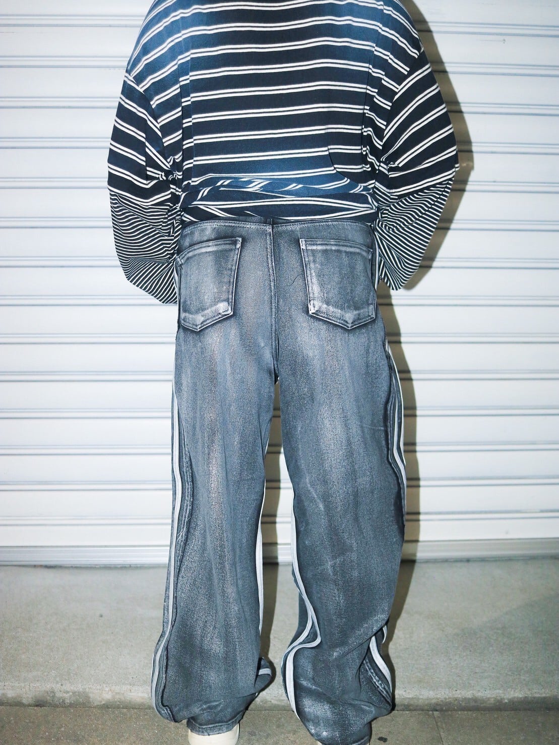 このオーバーサイズデニムパンツは、ダークグレーの洗い加工が施されたカジュアルなデザインが特徴です。サイドに白いラインが入り、モダンでスポーティな印象を加えています。ゆったりとしたシルエットと高めのウエストが快適さとトレンド感を両立。耐久性のあるコットン混紡素材を使用し、日常使いからストリートファッションまで幅広く対応可能です。